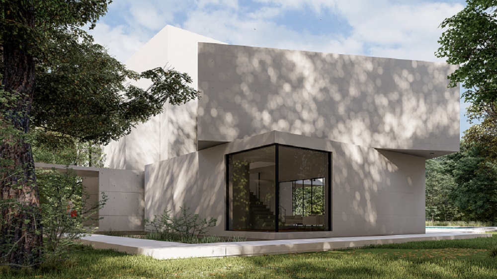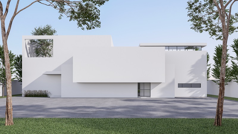 What should be done to achieve the effect of minimalism in buildings? First of all, simplify the mass and form of the building as much as possible, taking care to maintain symmetry, straight lines and shapes. Architects in minimalist projects propose monochromatic (white or grey, black) elevations made of maximum three types of materials (e.g. plaster, steel and wood). The most important element is the play of light, so it is important to adequately illuminate the building, use large glazing and abandon any unnecessary decorations.